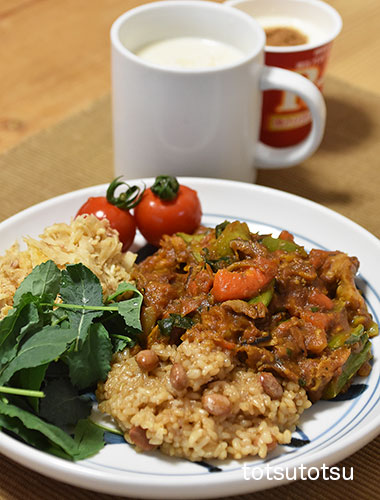 朝ご飯はチキンカレー。ご飯は大豆ブレンドの寝かせ玄米ごはんで90gくらいです。チキンカレー、ミニトマト、ブロッコリースーパースプラウト、切り干し大根と油揚げの胡麻和え、自然栽培の玄米甘酒とリンゴ酢入り豆乳、R1ヨーグルト+シナモン。