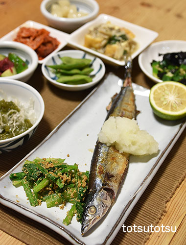 夜ご飯のメインは秋刀魚の塩焼き。秋刀魚の塩焼き、小松菜の胡麻和え、オクラの海苔和え、厚揚げのきのこネギあんかけ、冷凍茶豆、らっきょう、白菜キムチ、きゅうりの梅和え、メカブと糸寒天の酢の物。ダンナには剣先イカの刺身も。お米無しの夜ご飯です。