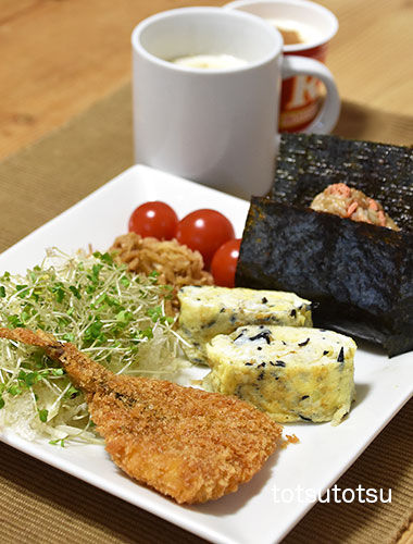 朝ご飯のメインは鯵フライ。鯵フライは温めるだけで食べられる大地を守る会の冷凍食品『レンジであじフライ』です。鯵フライ、梅ひじきちりめん入り卵焼き、鮭フレーク混ぜご飯のおにぎり、キャベツとブロッコリースーパースプラウトと糸寒天の甘酢和え、切り干し大根と油揚げのごま和え、ミニトマト、自然栽培の玄米甘酒とリンゴ酢入り豆乳、R1ヨーグルト+シナモン。おにぎりのご飯は大豆ブレンドの寝かせ玄米ごはんで90gくらいです。