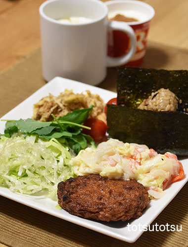 朝ご飯のメインは鰯バーグとカニカマ入りスクランブルエッグ。鰯バーグは鰯のすり身の練り製品です。カニカマはオーシャンキング。鰯バーグ、カニカマ入りスクランブルエッグ、しそゴマひじきふりかけ混ぜご飯のおにぎり、キャベツと糸寒天の甘酢和え、ベビーリーフ、切り干し大根と油揚げの胡麻和え、ミニトマト、自然栽培の玄米甘酒とリンゴ酢入り豆乳、R1ヨーグルト+シナモン。おにぎりのご飯は大豆ブレンドの寝かせ玄米ごはんで90gくらいです。