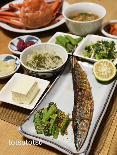 夜ご飯のメインは秋刀魚の塩焼きと茹で紅ズワイガニ。秋刀魚塩焼き、茹で紅ズワイガニ、小松菜の胡麻和え、九条ねぎとかえりいりこの炒め物、白菜キムチ、なめこのお味噌汁、冷凍茶豆、メカブと糸寒天の酢の物、木綿豆腐、梅干し、らっきょう。