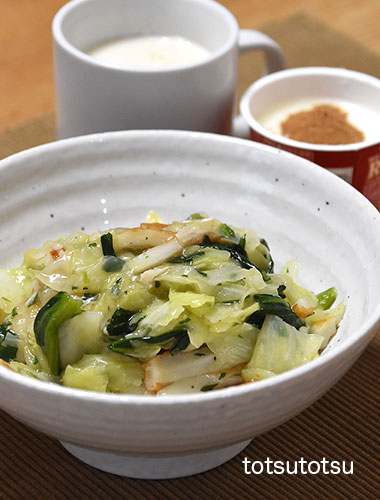 朝ご飯は中華丼。ちくわ、きのこミックス、た〜〜っぷりキャベツ、小松菜で。ご飯は雑穀米で100gくらいです。中華丼、自然栽培の玄米甘酒とリンゴ酢入り豆乳、R1ヨーグルト+シナモン。