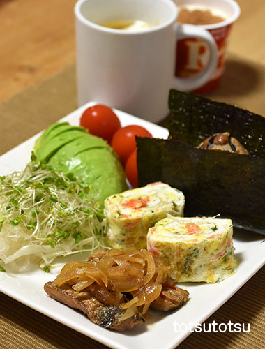 朝ご飯のメインは能登さば南蛮漬け。能登でとれた真さばの南蛮漬け。大地を守る会の冷凍食品です。能登さば南蛮漬け、わかめふりかけと鮭フレーク入り卵焼き、しそひじきちりめん混ぜご飯のおにぎり、キャベツとブロッコリースーパースプラウトと糸寒天の甘酢和え、アボカド、ミニトマト、自然栽培の玄米甘酒とリンゴ酢入り豆乳、R1ヨーグルト+シナモン。おにぎりのご飯は大豆ブレンドの寝かせ玄米ごはんで90gくらいです。