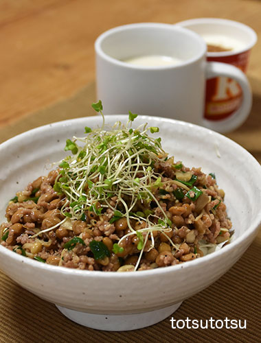 朝ご飯は納豆ひき肉丼。豚ひき肉、納豆、ネギ、ブロッコリースーパースプラウトで。納豆はナットウキナーゼ が熱に弱いので豚ひき肉とネギを炒めて火を止めちょっと冷ましてから混ぜてます。ご飯は雑穀米で100gくらいです。納豆ひき肉丼、自然栽培の玄米甘酒とリンゴ酢入り豆乳、R1ヨーグルト+シナモン。