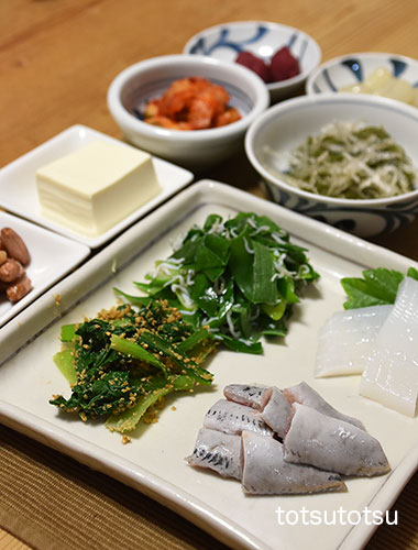 夜ご飯のメインは鰯とアオリイカのお刺身。スルメイカや剣先イカのお刺身よりアオリイカのお刺身が好きです。鰯とアオリイカの刺身、小松菜の胡麻和え、九条ねぎとシラスの炒め物、メカブと糸寒天の酢の物、らっきょう、梅干し、白菜キムチ、絹ごし豆腐、酢ピーナッツ。ダンナには真鯛の刺身も。お米無しの夜ご飯です。