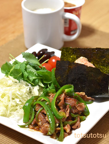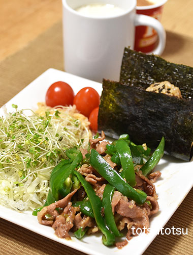 朝ご飯のメインは青椒肉絲。青椒肉絲、しそひじきふりかけ混ぜご飯のおにぎり、キャベツとブロッコリースーパースプラウトと糸寒天の甘酢和え、切り干し大根と油揚げの胡麻和え、ミニトマト、自然栽培の玄米甘酒とリンゴ酢入り豆乳、R1ヨーグルト+シナモン。おにぎりのご飯は大豆ブレンドの寝かせ玄米ごはんで90gくらいです。