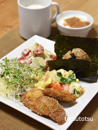 朝ご飯のメインはスパイシーササミカツ。スパイシーササミカツは温めるだけで食べられる大地を守る会の冷凍食品です。スパイシーササミカツ、カニカマと九条ねぎ入りスクランブルエッグ、しそひじきふりかけ混ぜご飯のおにぎり、キャベツとブロッコリースーパースプラウトと糸寒天とかえりいりこの甘酢和え、アボカドとミニトマトのマヨネーズ和え、自然栽培の玄米甘酒とリンゴ酢入り豆乳。ナチュレ恵ヨーグルト+ハチミツ+シナモン。おにぎりのご飯は大豆ブレンドの寝かせ玄米ごはんで90gくらいです。