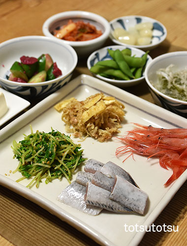 夜ご飯のメインは鰯と甘エビのお刺身。鰯と甘エビの刺身、豆苗の胡麻和え、切り干し大根と油揚げの胡麻和え、メカブと糸寒天の酢の物、冷凍茶豆、らっきょう、白菜キムチ、きゅうりの梅和え、絹ごし豆腐。ダンナには鰯の塩焼きも。お米無しの夜ご飯です。