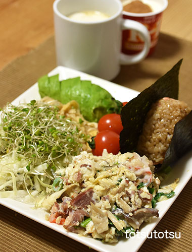 朝ご飯のメインは具だくさんスクランブルエッグ。カニカマオーシャンキングの極み、ハム、きのこミックス、九条ねぎ、卵で。具だくさんスクランブルエッグ、鮭フレーク混ぜご飯のおにぎり、キャベツとブロッコリースーパースプラウトと糸寒天の甘酢和え、切り干し大根と油揚げの胡麻和え、ミニトマト、アボカド、自然栽培の玄米甘酒とリンゴ酢入り豆乳、R1ヨーグルト+シナモン。おにぎりのご飯は十五穀ブレンドの寝かせ玄米ごはんで90gくらいです。