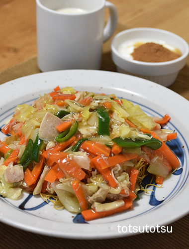 朝ご飯は長崎皿うどん。長崎新地中華街 新和楼の長崎皿うどん、ハム、た〜〜〜っぷりキャベツ、きのこミックス、人参、ピーマンで。長崎皿うどん、自然栽培の玄米甘酒とリンゴ酢入り豆乳、ビヒダスヨーグルト+ハチミツ+シナモン。