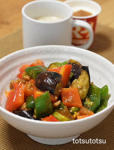 朝ご飯は麻婆野菜丼。大地を守る会のひき肉入り冷凍麻婆の素、ナス、ピーマン、パプリカで。ご飯は雑穀米で100gくらいです。麻婆野菜丼、自然栽培の玄米甘酒とリンゴ酢入り豆乳、R1ヨーグルト+シナモン。