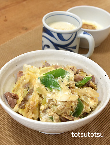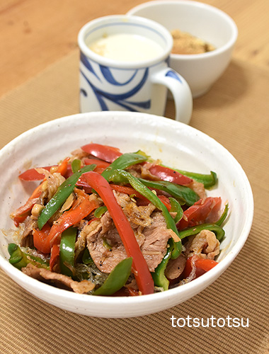 朝ご飯は青椒肉絲丼。青椒肉絲丼、自然栽培の玄米甘酒とりんご酢入り豆乳、ヨーグルト+ハチミツ+シナモン+黒ごまアーモンドきなこ。丼のご飯は十五穀ブレンドの寝かせ玄米ごはんで90gくらいです。