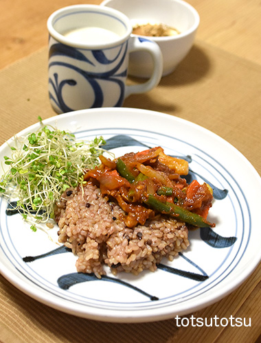 朝ご飯はハヤシライス。ハヤシライス、ブロッコリースーパースプラウト、自然栽培の玄米甘酒とりんご酢入り豆乳、ヨーグルト+ハチミツ+シナモン+黒ごまアーモンドきなこ。ご飯は十五穀ブレンドの寝かせ玄米ごはんで90gくらいです。