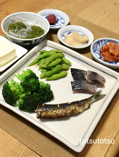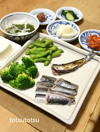 夜ご飯のメインは鰯の酢じめと塩焼き。鰯の酢じめ、鰯の塩焼き、ブロッコリー、枝豆、白菜キムチ、大根の甘酢漬け、らっきょう、きゅうりのぬか漬け、梅干し、メカブと玉ねぎと糸寒天の酢の物、絹ごし豆腐。お米無しの夜ご飯です。