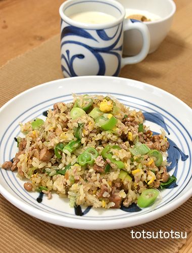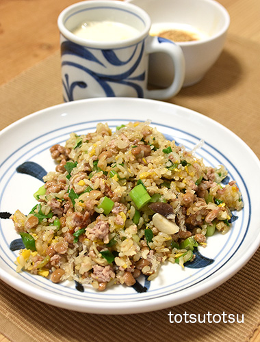 朝ご飯は納豆炒飯。AJINOMOTOのザ・チャーハンに豚ひき肉、きのこミックス、九条ネギ、糸寒天、納豆をプラス。納豆炒飯、自然栽培の玄米甘酒とりんご酢入り豆乳、ヨーグルト+ハチミツ+シナモン+黒ごまアーモンドきなこ。