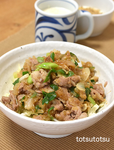 朝ご飯は豚丼。豚丼、自然栽培の玄米甘酒とりんご酢入り豆乳、ヨーグルト+ハチミツ+シナモン+黒ごまアーモンドきなこ。丼のご飯は十五穀ブレンドの寝かせ玄米ごはんで90gくらいです。