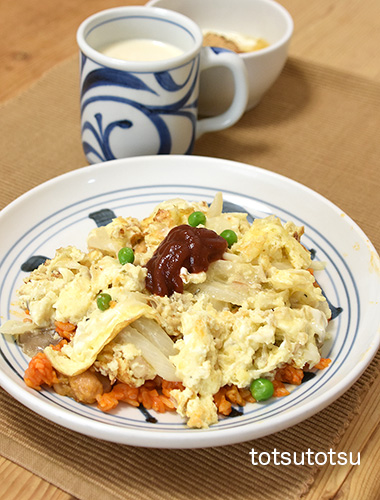 朝ご飯はオムライス。ニチレイの完熟トマトのチキンライスを使って。卵にはきのこミックスと玉ねぎをプラス。オムライス、自然栽培の玄米甘酒とりんご酢入り豆乳、ヨーグルト+ハチミツ+シナモン+黒ごまアーモンドきなこ。