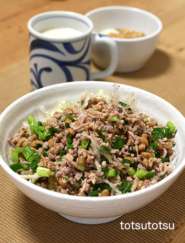 朝ご飯は納豆ひき肉丼。納豆ひき肉丼、自然栽培の玄米甘酒とりんご酢入り豆乳、ヨーグルト+ハチミツ+シナモン+黒ごまアーモンドきなこ。丼のご飯は十五穀ブレンドの寝かせ玄米ごはんで90gくらいです。