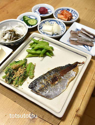 夜ご飯のメインは鰯の塩焼きと鯵のお刺身。鰯の塩焼き、鯵の刺身、小松菜の胡麻和え、枝豆、白菜キムチ、大根の甘酢漬け、らっきょう、きゅうりのぬか漬け、梅干し、メカブと玉ねぎと糸寒天の酢の物、木綿豆腐。お米無しの夜ご飯です。