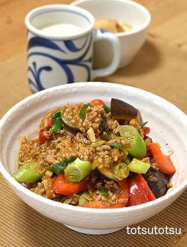 朝ご飯は麻婆野菜丼。麻婆野菜丼、自然栽培の玄米甘酒とりんご酢入り豆乳、ヨーグルト+ハチミツ+シナモン+黒ごまアーモンドきなこ。丼のご飯は十五穀ブレンドの寝かせ玄米ごはんで90gくらいです。