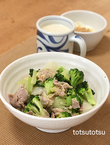 朝ご飯は豚肉と野菜のポン酢炒め。味付けはポン酢だけです。豚肉ときのこミックスとトップバリュのオーガニック洋風野菜ミックスで。豚肉と野菜のポン酢炒め、自然栽培の玄米甘酒とりんご酢入り豆乳、ヨーグルト+ハチミツ+シナモン+黒ごまアーモンドきなこ。丼のご飯は十五穀ブレンドの寝かせ玄米ごはんで90gくらいです。