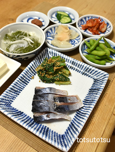 夜ご飯のメインは自家製のしめ鯖と自家製オイルサーディン。しめ鯖は何度か作っているのですが未だ試行錯誤中。しめ鯖、オイルサーディン、小松菜の胡麻和え、枝豆、大根の甘酢漬け、らっきょう、白菜キムチ、きゅうりのぬか漬け、梅干し、メカブと玉ねぎと糸寒天の酢の物、絹ごし豆腐。お米無しの夜ご飯です。