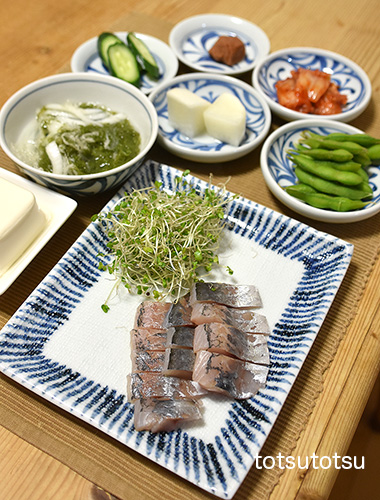 夜ご飯のメインは鯵のお刺身と自家製しめ鯖。鯵の刺身、自家製しめ鯖、小松菜の胡麻和え、枝豆、白菜キムチ、きゅうりのぬか漬け、新生姜の甘酢漬け、梅干し、メカブと玉ねぎと糸寒天の酢の物、絹ごし豆腐。お米無しの夜ご飯です。