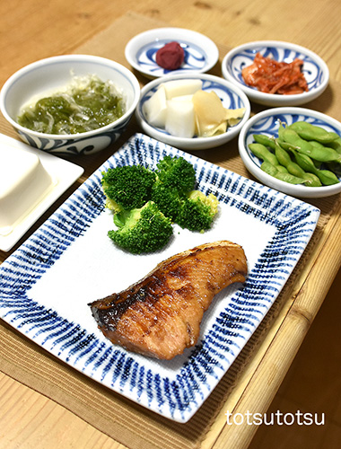 夜ご飯のメインは天然鰤の照り焼き。天然鰤の照り焼き、ブロッコリー、枝豆、大根と生姜の甘酢漬け、白菜キムチ、梅干し、メカブと玉ねぎと糸寒天の酢の物、絹ごし豆腐。お米無しの夜ご飯です。