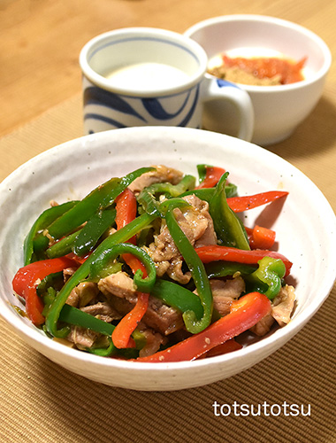 朝ご飯は青椒肉絲丼。青椒肉絲丼、自然栽培の玄米甘酒とりんご酢入り豆乳、ヨーグルト+ハチミツ+シナモン+トマトジャム+黒ごまアーモンドきな粉。丼のご飯は十五穀ブレンドの寝かせ玄米ごはんで90gくらいです。