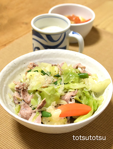 朝ご飯は豚肉とキャベツの甘辛丼。豚肉とキャベツの甘辛丼、自然栽培の玄米甘酒とりんご酢入り豆乳、ヨーグルト+ハチミツ+シナモン+トマトジャム+黒ごまアーモンドきな粉。丼のご飯は十五穀ブレンドの寝かせ玄米ごはんで90gくらいです。