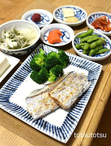 夜ご飯のメインは秋刀魚の干物と鰯の酢じめ。干物は冷蔵庫で作って冷凍保存してたものです。秋刀魚の干物、鰯の酢じめ、ブロッコリー、枝豆、白菜キムチ、生姜の甘酢漬け、きゅうりのぬか漬け、梅干し、メカブと玉ねぎと糸寒天の酢の物、木綿豆腐。お米無しの夜ご飯です。