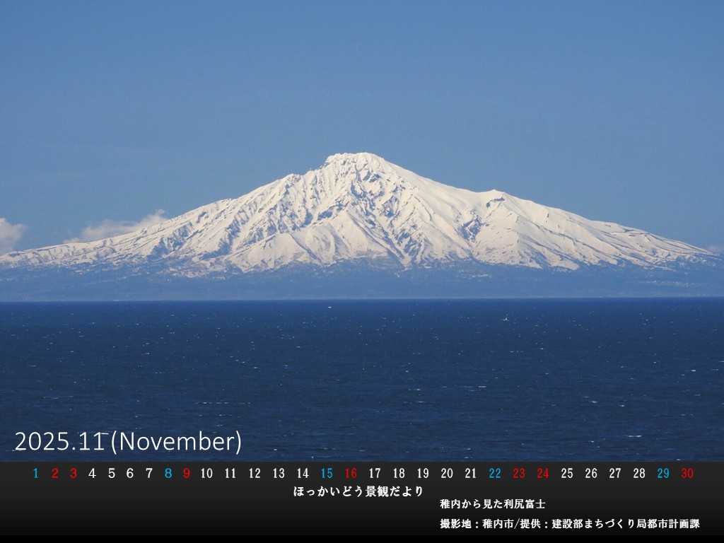 北海道建設部まちづくり局都市計画課です。都市計画課では、北海道の美しい景観をPRするデスクトップ景観カレンダーを配布しています。魅力的な写真をご覧ください! 11月は、稚内市の「稚内から見た利尻富士」です。 写真提供:北海道建設部まちづくり局都市計画課 稚内市は北海道の最北端に位置する都市で「日本最北のまち」として知られています。オホーツク海と日本海の2つの海に面し、自然の美しさと厳しさを感じさせる場所です。 11月の稚内から望む利尻富士は、冬の訪れを告げるように、白く雪をまとった姿です。秋の名残を海風に混じりながらも、空気は次第に冷たさが増し、冬の厳しさが近づいてくると感じます。こちらの写真のように冬特有の透明感ある青空を背景に見る利尻富士は神々しいですね。是非、稚内へ訪れてみてください。皆さん、ぜひダウンロードして、デスクトップの背景にご利用ください。※下記にURLを載せておきますので、是非ホームページからご覧ください。 https://www.kita-smile.jp/hokkaido_keikan