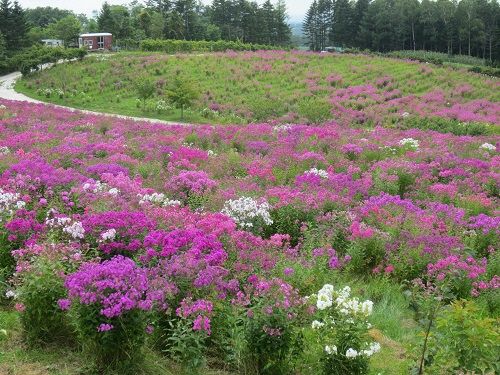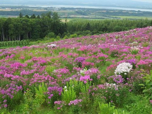 また、網走湖や 女満別方面 の平野 が一望でき、 フロックス の 赤 ・ ピンク ・ 紫 ・ 白 と オホーツクブルーの 空 との コントラストも素敵です