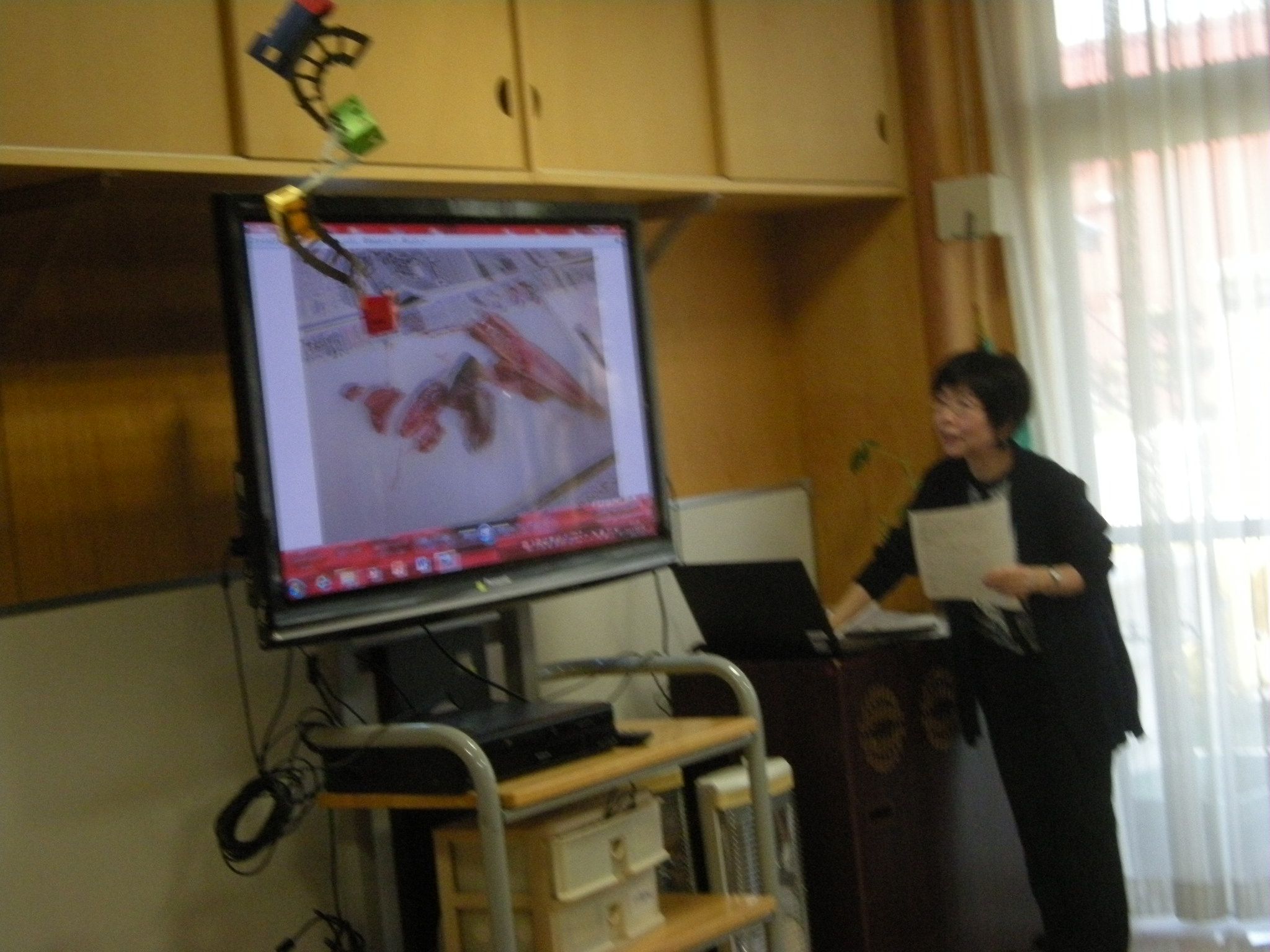 身体は食べた物でつくられること、体や脳にとって朝ごはんの重要性、噛むことで唾液の分泌が増え食べ物の消化・吸収が促進されることや、口内殺菌で虫歯や病気感染の予防効果があること、脳の活性化や骨格の発達などのほか、北海道食の自給ネットワークが取り組んでいる「食育講座」の一環で魚をさばくことについて、講師の漁師さんの話や参加した子どもの様子などを交え、はじめは魚を嫌がっていた子どもも講座が終わる頃にはすっかり馴れて、自宅で魚をさばくなど子ども達の自信にもつながっているという話がありました。