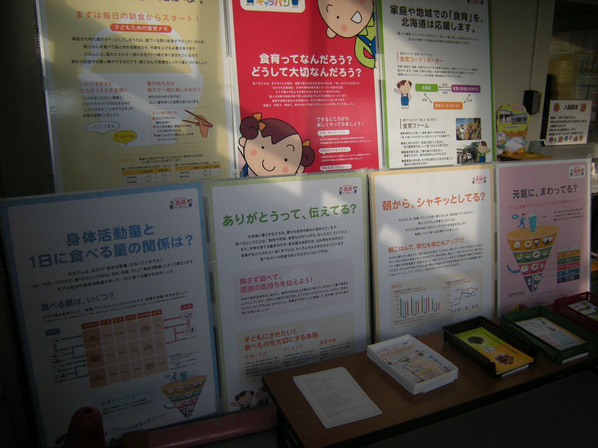 今回の食育講座に関連し、1週間に亘り、もいわ幼稚園の玄関に食育パネルの掲示と食育関係リーフレットや管内農産物等のパンフレットなども配置して啓発を行いました。