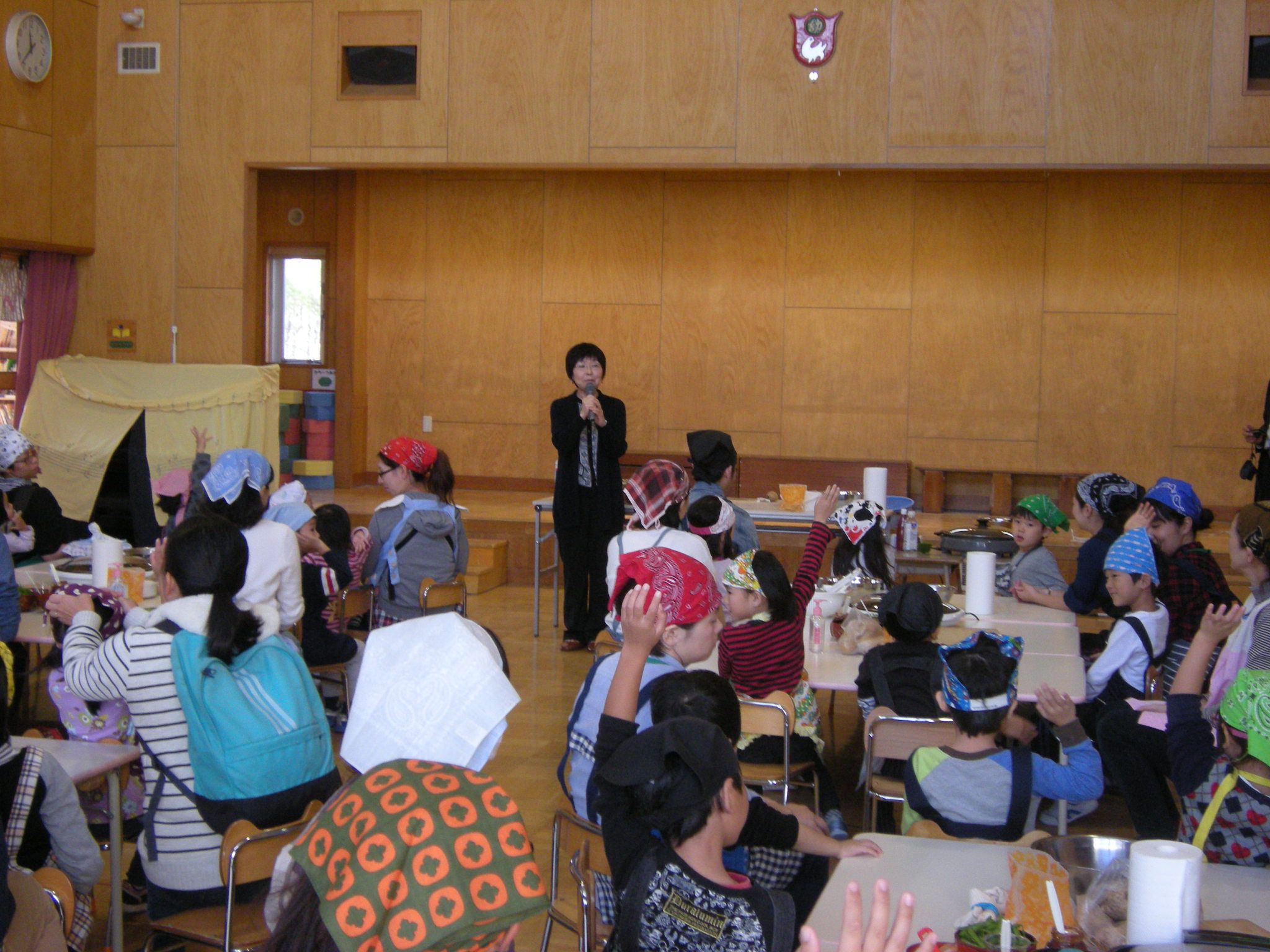 午前11時半に開会し、はじめにNPO法人北海道食の自給ネットワーク事務局長の大熊久美子さんに「うしさんをたべるおはなし」と題して園児と保護者を対象に講話をしていただきました。
