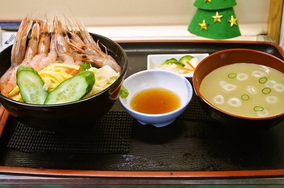 増毛の甘えび丼。全国有数の漁獲量を誇る甘えびの産地ならではのメニューで、こちらもお値打ちの650円。お昼前には完売していました。(美味しくいただきましたぁ