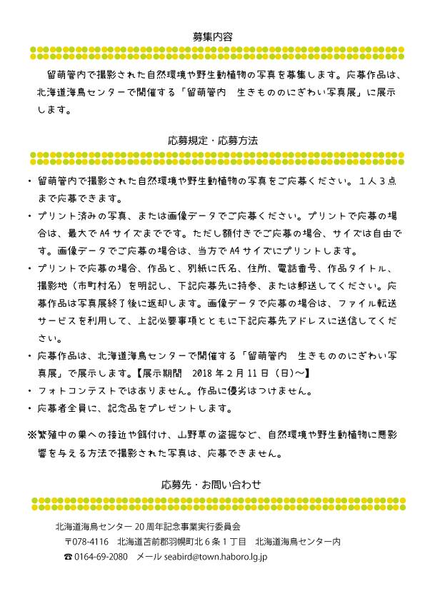 応募いただいた作品は、北海道海鳥センターで開催する「留萌管内 生きもののにぎわい写真展」に展示されます。応募規定や応募方法など詳しくは、上記のチラシでご確認ください。![]()