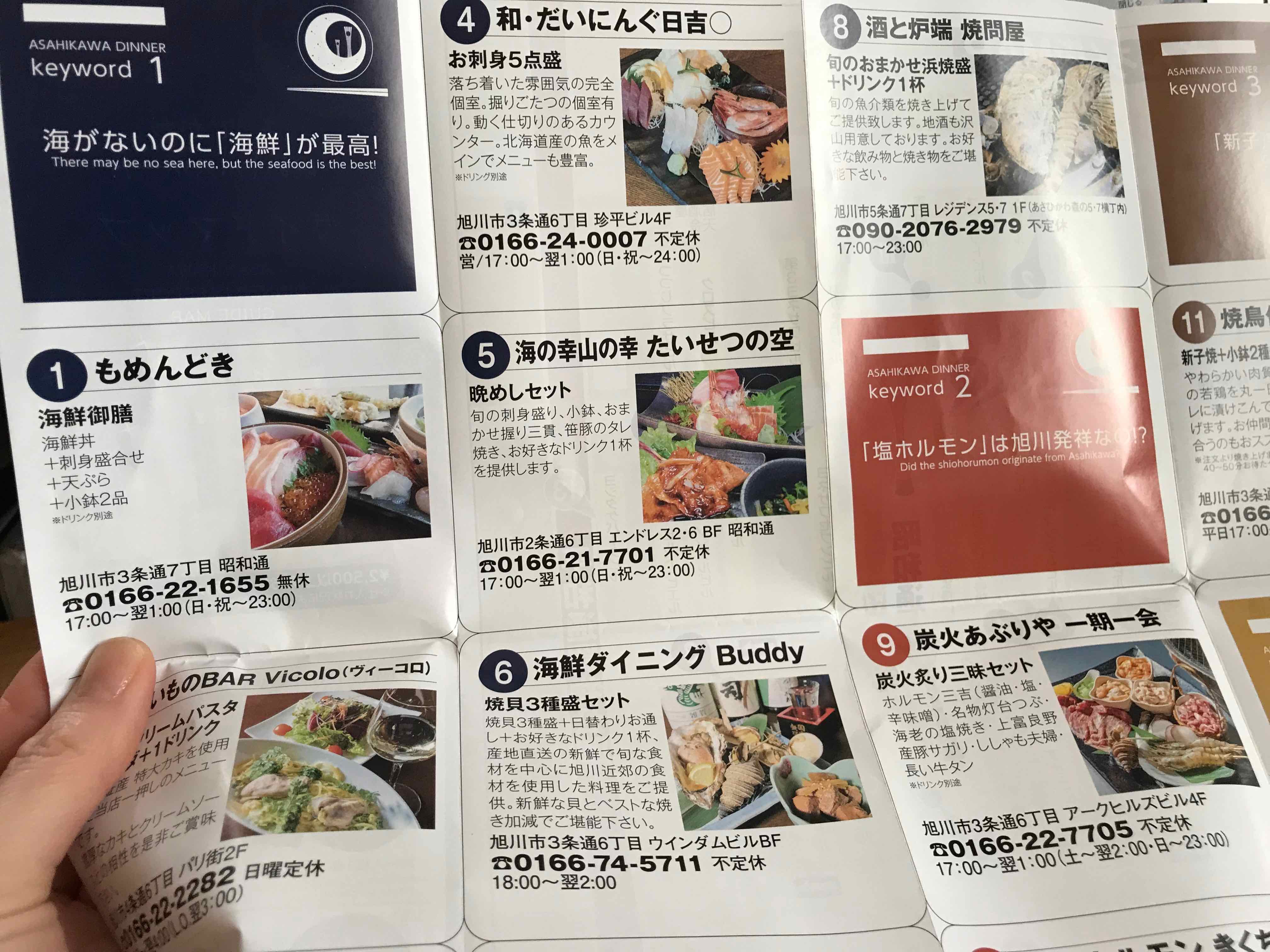 「あさひかわ晩めしパスポート」は、「旭川の名物って何?」「ラーメン以外で何が美味しいの?」「せっかく旭川に来たからには名物を食べたい!」という、旭川に宿泊されるお客様のために、旭川ならではのお食事を楽しんでもらうもの。5つのキーワードからお店を選んでもらいます。