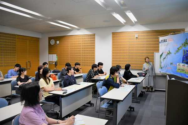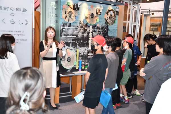 ​7月8日、法政大学文学部地理学科の学生19名、教員1名が道東地域に関する研修授業の一環でニ・ホ・ロに来館しました。当センターでは、館内見学と、択捉島元島民の鈴木咲子さんの講話を聞き、北方領土問題について関心を深めていました。​