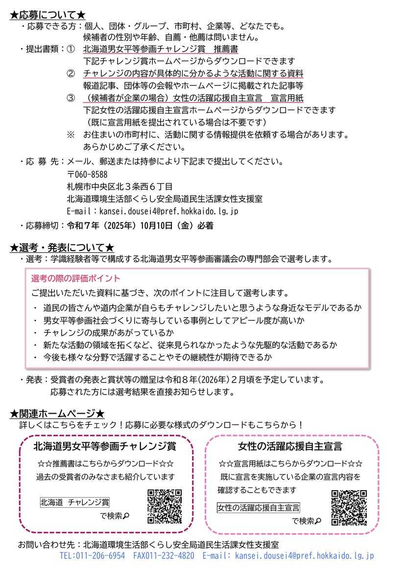 北海道男女平等参画チャレンジ賞 候補者募集 - 環境生活部くらし安全局道民生活課 (hokkaido.lg.jp)