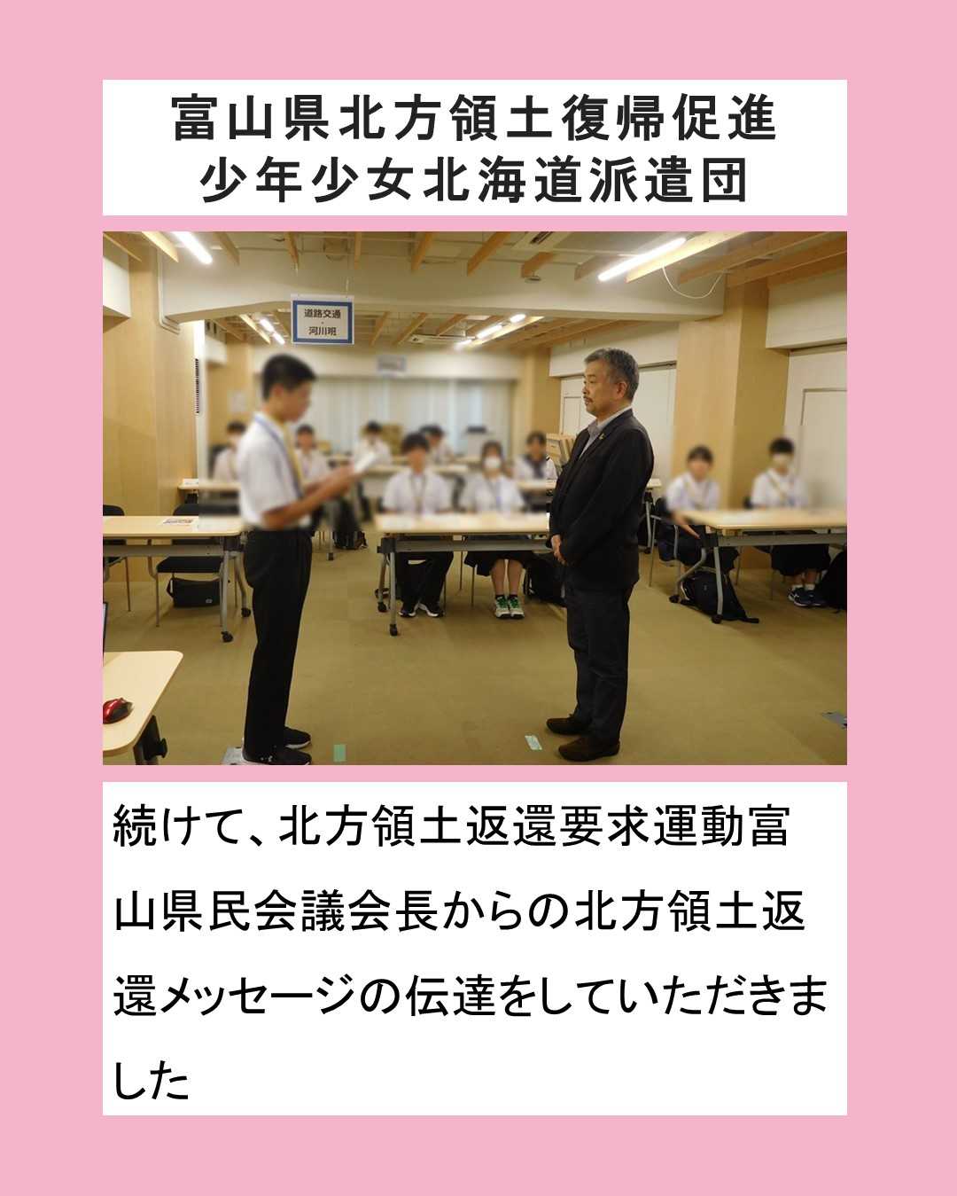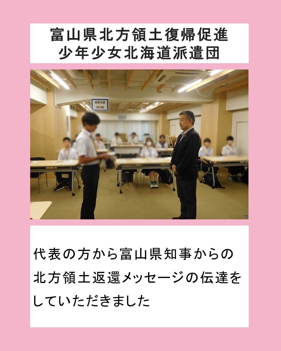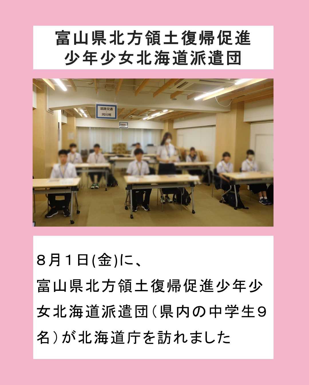 8月1日 ( 金 ) 、富山県北方領土復帰促進少年少女北海道派遣団(県内の中学生9名)が道庁を訪れ、代表の方から富山県知事と北方領土返還要求運動富山県民会議会長からの北方領土返還メッセージの伝達を行いました。