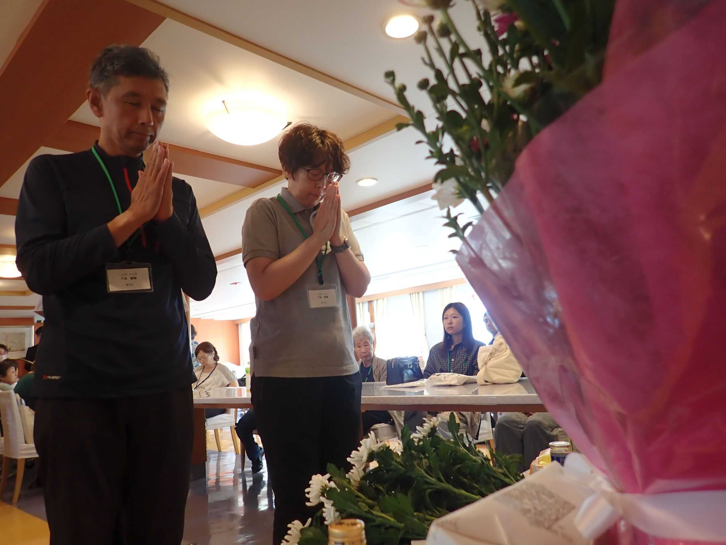 当初、4階デッキにて慰霊式を行う予定でしたが、突然の雨により、急遽、船内で慰霊式を実施することとし、慰霊式では、追悼の辞が述べられた後、参加者全員による献花が行われました。