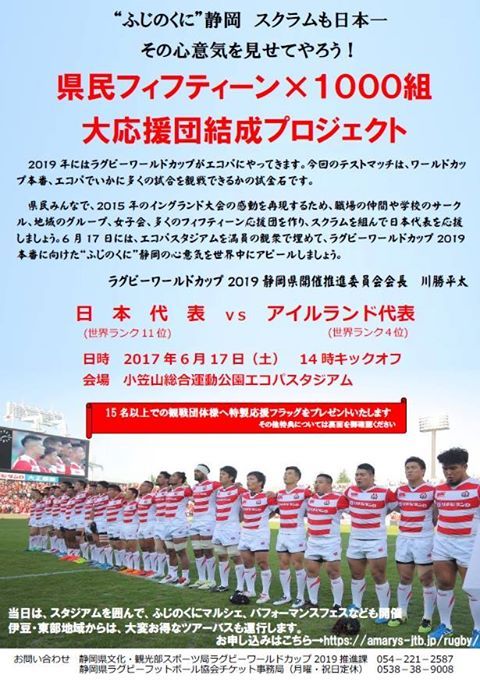 「いいねがあるある静岡県。」より、観光情報をお届けします2015年ラグビーワールドカップイングランド大会での日本vs南アフリカの感動は、まだ皆さんの記憶に新しいところではないでしょうか? 私は、ラグビーと言えば80年代に放送された熱血ドラマぐらいしか知らなかったのですが、あの試合を見てラグビーのにわかファンとなってしまいました。 そのラグビー日本代表戦が、6/17(土)に、エコパスタジアムで行われます。相手は、世界ランク4位のアイルランド代表、白熱した試合が期待されます。2019年のワールドカップでも、日本代表がアイルランド代表と対戦することが決まり、今回の代表戦はワールドカップ本番の前哨戦とも言える試合です。職場の仲間や、学校のサークル、女子会など、家族やお友達で応援団を作り、日本代表を応援しましょう。