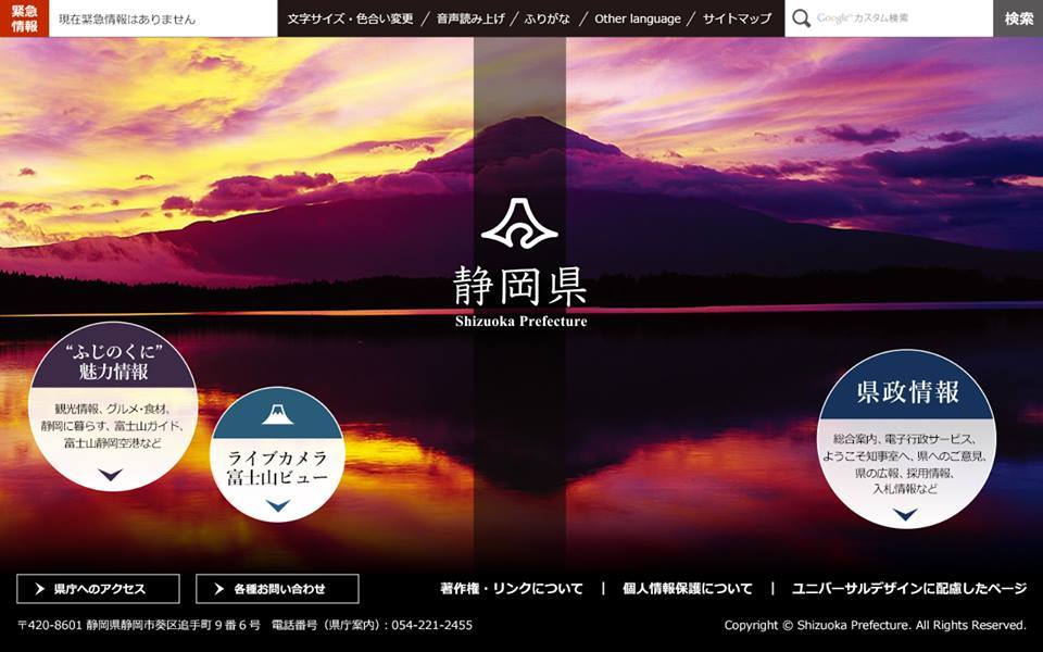 静岡県ではこれまでのホームページの上層に「総合トップページ」を新設し、3月29日から公開しています。今回のリニューアルでは、訪問者が得たい情報を探しやすくするため、危機管理情報や電子申請などの「県政情報」と、観光・食など県の魅力を発信する「魅力情報」に整理しています。「総合トップページ」は、情報の入り口としての機能のほか、富士山、駿河湾や四季折々の美しくダイナミックな風景の写真を表示し静岡県の魅力をPRしています。東部、中部、西部、伊豆4枚の写真がアクセスする毎にランダムに表示されます。また、写真は季節ごとに更新されますので、リニューアルされたホームページに是非遊びに行ってみてください。http://www.pref.shizuoka.jp/