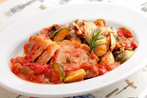 県がエリート種の豚から系統造成した「ふじのくに いきいきポーク」はジューシーな赤身と甘みを感じる脂身のバランスに優れた豚肉ですこの食材を、静岡市葵区「オステリアティアロカ」の荒木雅貴さんに料理していただきました 作り方のポイントや栄養価等の詳細は、県民だより2017年3月号をご覧ください。材料【2人分】ふじのくにいきいきポーク(ロース)240g、芽キャベツ10個(または春キャベツ4分の1個)、カキ(むき身)8個、アサリ(事前に要砂抜)12個、ニンニク1片、ローズマリー1枝、小麦粉(少々)、塩・白コショウ(適量)、カットトマト(水煮)100cc、ケイパー8個、白ワイン50cc、白ワインビネガー15cc、オリーブオイル40cc、片栗粉(少々)作り方(所要時間:約20分)(1)芽キャベツを2分ほどゆで、氷水にさらした後、くし切りにする。 (春キャベツの場合はそのままざく切りに)(2)2cmほどの厚切りにした「ふじのくにいきいきポーク」にすじ切りを施し、 塩・白コショウを振る。そこに小麦粉をまぶし、しっかり叩いておく。(3)フライパンにオリーブオイル(30cc)を注ぎA(ニンニク、ローズマリー) を入れ弱火で加熱。オイルに香りが移ったらAだけ取り出す。(4)(2)をフライパンに入れ中火で焼き、片側に焼き色が付いたら裏返し、 芽キャベツ、カキ、アサリ、ケイパーを入れる。(5)芽キャベツがしんなりしてきたらワインとビネガーを加える。(6)アルコール分が飛んだらカットトマトを入れフタをする。(7)アサリの殻が開いたら肉、カキ、アサリを取り出す。(8)強火で残ったソースを煮詰め、水溶き片栗粉でとろみをつけたらカキとアサリを戻す。(9)そぎ切りにした肉を皿に盛り(8)をかける。(10)オリーブオイル(10cc)をまわしかけたら出来上がり。