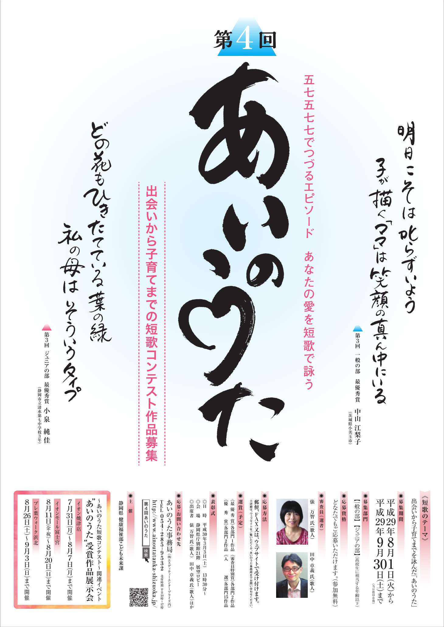 出会いから子育てまでの短歌「あいのうた」作品募集中!第4回「あいのうた〜出会いから子育てまでの短歌コンテスト〜」 短歌の創作を通して、出会いや、家族・親子の絆、子育ての喜びなどを思い出していただき、それを大切にする気運を醸成し、「子育ては尊い仕事」の理念の浸透を図るため、出会いから子育てまでを詠んだ短歌「あいのうた」を募集しています。 この夏は、恋人や家族の顔を思い浮かべて、恋人にささげる愛、未来の家族に向けての愛、家族から受けた愛を「五七五七七」で表現してみませんか。◎短歌コンテスト概要 ・短歌のテーマ 出会いから子育てまでを詠んだ「あいのうた」 ・募集期間 平成29年9月30日(土)まで(当日消印有効) ・部 門 一般の部、ジュニアの部(高校生に相当する年齢以下) ・応募資格 どなたでも御応募いただけます。(参加無料) ・選 賞 最優秀賞1点、優秀賞2点、審査員特別賞2点、入選15点(各部門共通) ※最優秀賞、優秀賞、審査員特別賞受賞者は、来年3月3日(土)に静岡県庁 別館21階で行われる表彰式に招待いたします。 ・審査員 俵万智氏(歌人)、田中章義氏(歌人) ・応募方法 あいのうた事務局まで郵送、FAXで御応募ください。 また、専用HPからでも応募可能です。 ※あいのうた事務局 郵便番号 422-8058 住 所 静岡県静岡市駿河区中原563 電 話 054-285-9532 F A X 054-285-9614 専用HPはこちら