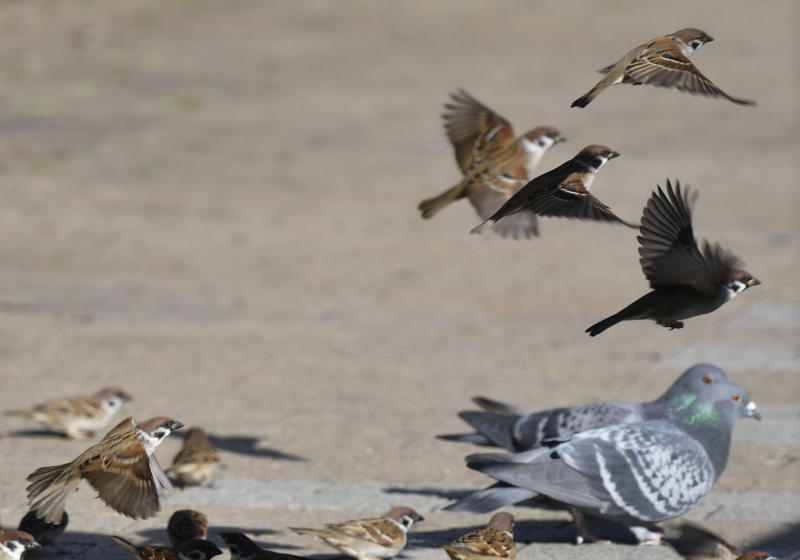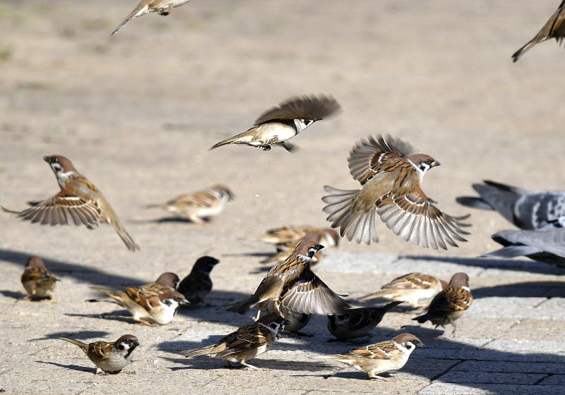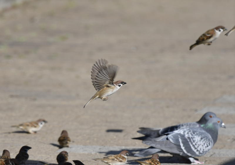 遊歩道で餌拾いの雀さんたち