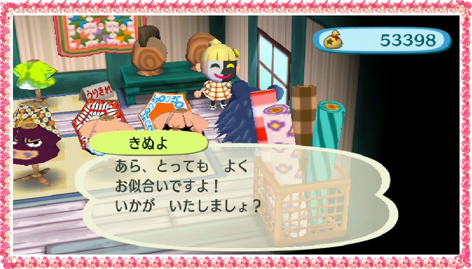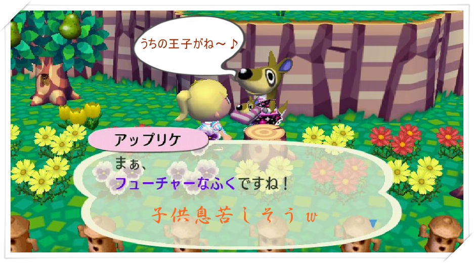 試着から始める森の生活並んだの2度目けんちゃんの村が開いてたので訪問してきた両親に結婚の挨拶をしている・・・というシチュエーションらしい言われないとわからないけどw実にそれっぽく見えてきたから 不思議託児所かな?カワイイお部屋でした風水の部屋、うちも無くそうかな絵画は友達のおかげであと1枚で揃うし飛んでる風船には興味がないし他にメリットってあるのかな??昨日は他にマリカで遊んだ全員軽量級だらけ大会あたりで吹っ飛ぶ不安はないな と思ったけどやっぱり吹っ飛んだーーーwコースをCOMに選択させると偏る気がする・・・昨日はキノコキャニオンが多めだったなぁ次回はノリスコカップです。