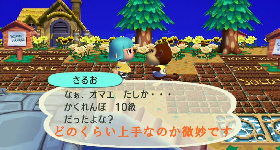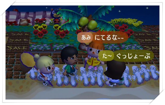 7月のおまじないの使えなさ・・・今月も腹立たしいwwwもっすん復活!会うたびツボル子供を実家にお泊りさせてたので悠々自適に森生活を楽しみましたw色んな村に行くたび出会ったえびちゃんwww26時に、のんちゃんの村から追い出されて泣きながら開門したら またえびちゃんwww元気だなーって人の事いえやしない911さんもフラッと来て 虫取りして27時に催促されてお開きwwwだけど眠れないのでこそっと開門したらともさんがキターーー!!!こんな時間に遊んでくれる友達は貴重だ~ 嬉しいなぁ。その後マリカーのタイムアタックしたりmixiを・・・と1年以上放置してたのをいじってみるなんでこんなに眠れないのかなぁ~というか、ともさんが遊びに来てテンション上がっちゃたウチにとってタミフル的存在なのかなとりあえず26時以降元気な友達連絡ください
